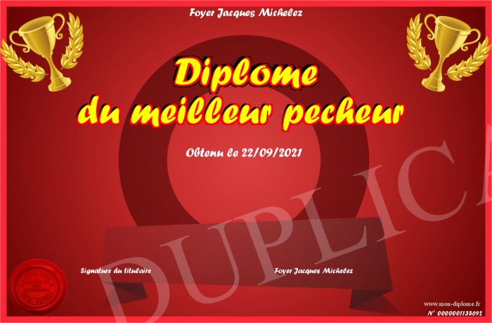 Envoyez par email votre Diplôme du meilleur pecheur personalisé