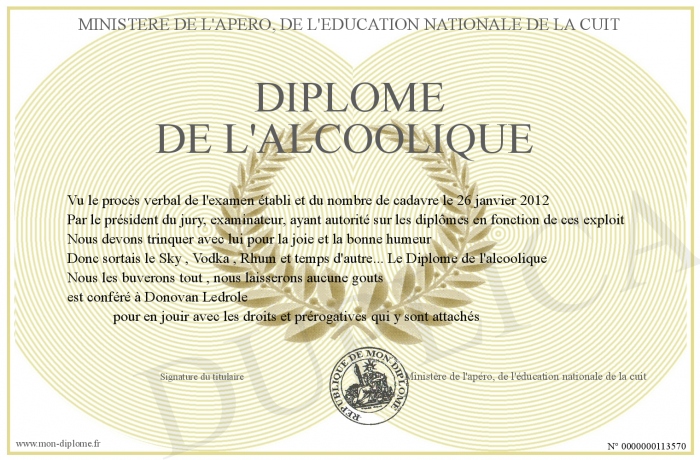 Envoyez par email votre Diplôme de l'alcoolique personalisé