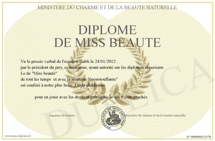 Envoyez par email votre Diplôme de Miss beauté personalisé