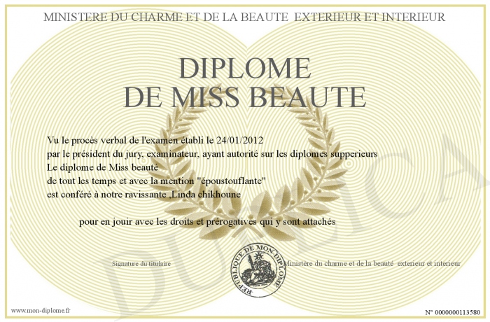 Envoyez par email votre Diplôme de Miss beauté personalisé