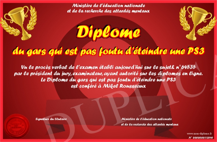 Envoyez par email votre Diplôme du gars qui est pas foutu d'éteindre une PS3 personalisé