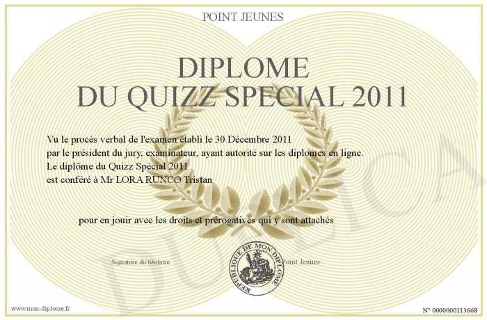 Envoyez par email votre Diplôme du Quizz Spécial 2011 personalisé