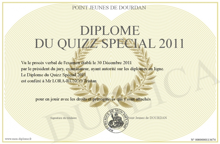 Envoyez par email votre Diplôme du Quizz Spécial 2011 personalisé