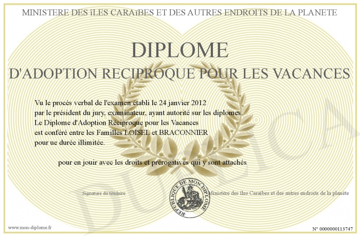 Envoyez par email votre Diplôme d'Adoption Réciproque pour les Vacances personalisé