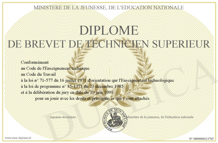 Envoyez par email votre Diplome de Brevet de Technicien Supérieur personalisé