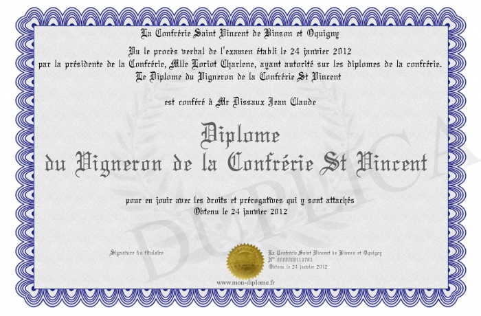 Envoyez par email votre Diplôme du Vigneron de la Confrérie St Vincent personalisé