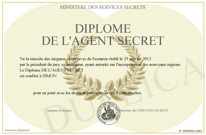 Envoyez par email votre Diplôme DE L'AGENT SECRET personalisé