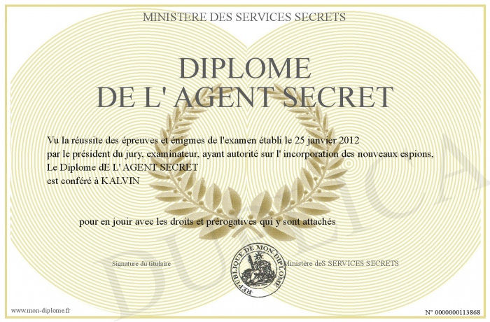 Envoyez par email votre Diplôme dE L' AGENT SECRET personalisé