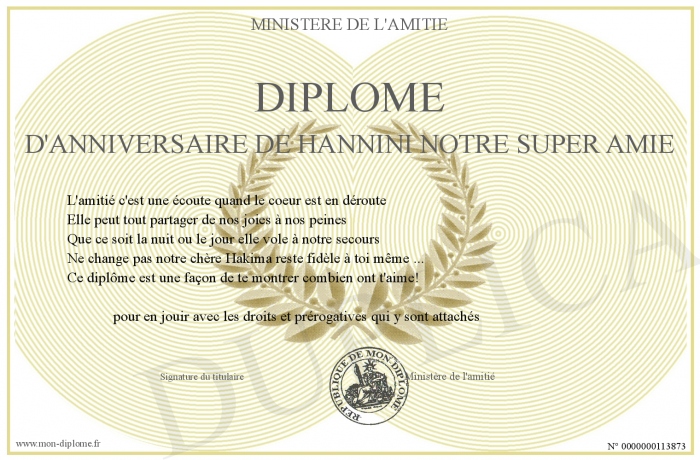 Envoyez par email votre Diplôme d'anniversaire de Hannini notre super amie personalisé