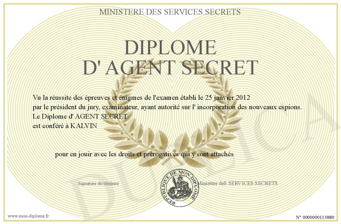 Envoyez par email votre Diplôme d' AGENT SECRET personalisé