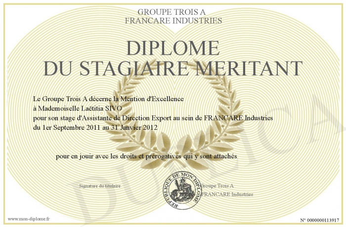 Envoyez par email votre Diplôme du stagiaire méritant personalisé