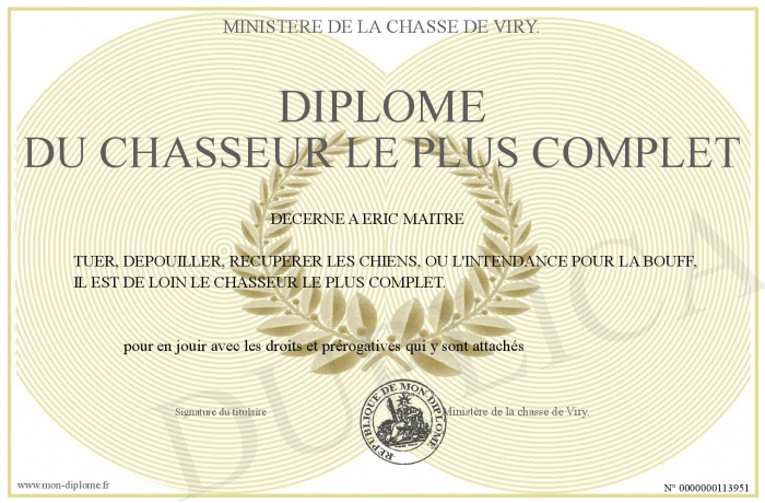 Envoyez par email votre DIPLOME DU CHASSEUR LE PLUS COMPLET personalisé