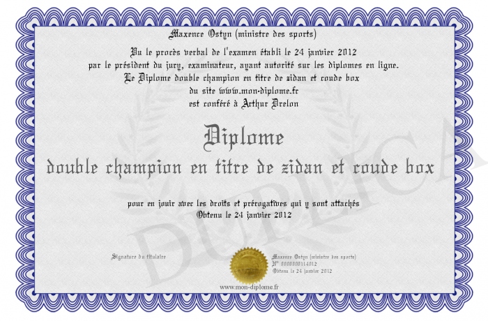 Envoyez par email votre Diplôme double champion en titre de zidan et coude box personalisé