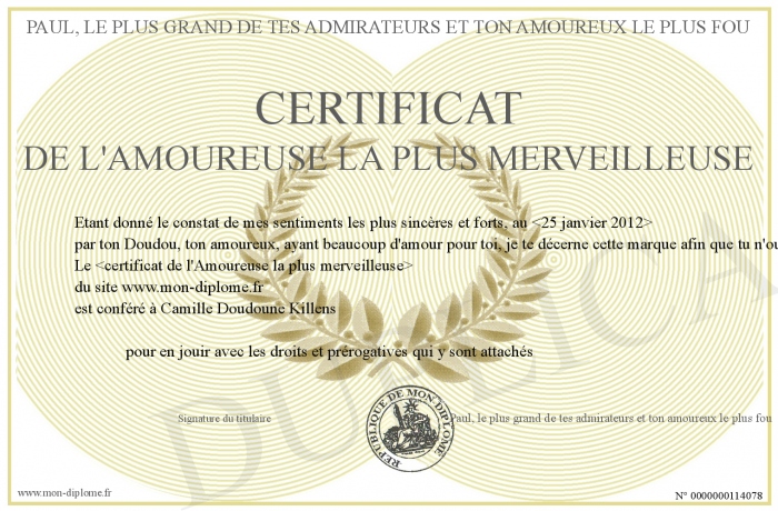 Envoyez par email votre certificat de l'Amoureuse la plus merveilleuse personalisé