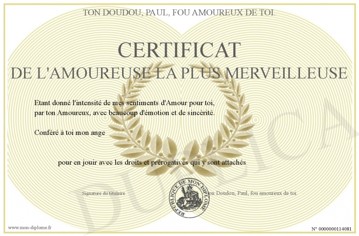 Envoyez par email votre certificat de l'Amoureuse la plus merveilleuse personalisé