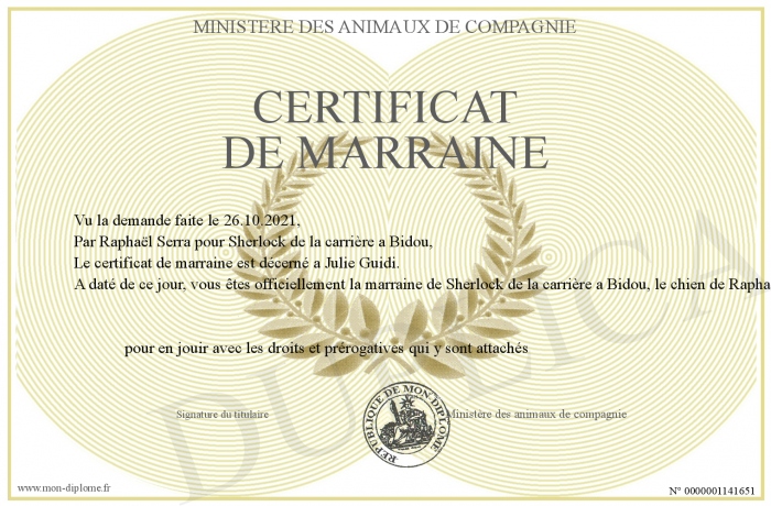 Envoyez par email votre Certificat de marraine personalisé