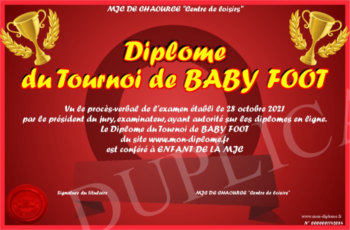 Envoyez par email votre Diplôme du Tournoi de BABY FOOT personalisé