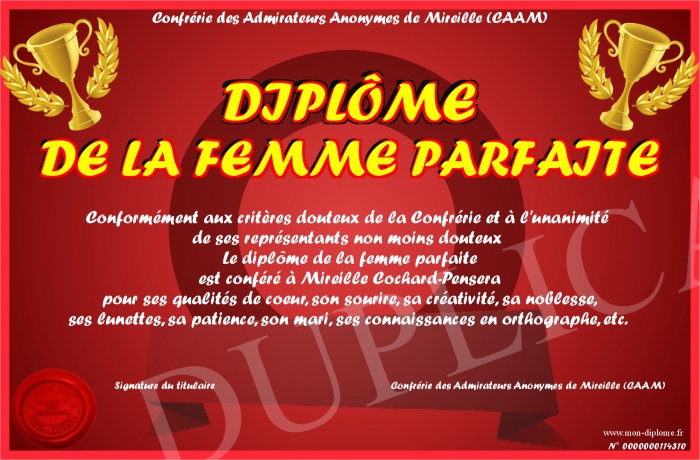 Envoyez par email votre DIPLÔME DE LA FEMME PARFAITE personalisé
