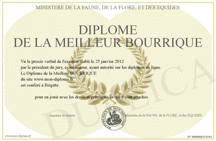 Envoyez par email votre Diplôme de la Meilleur BOURRIQUE personalisé