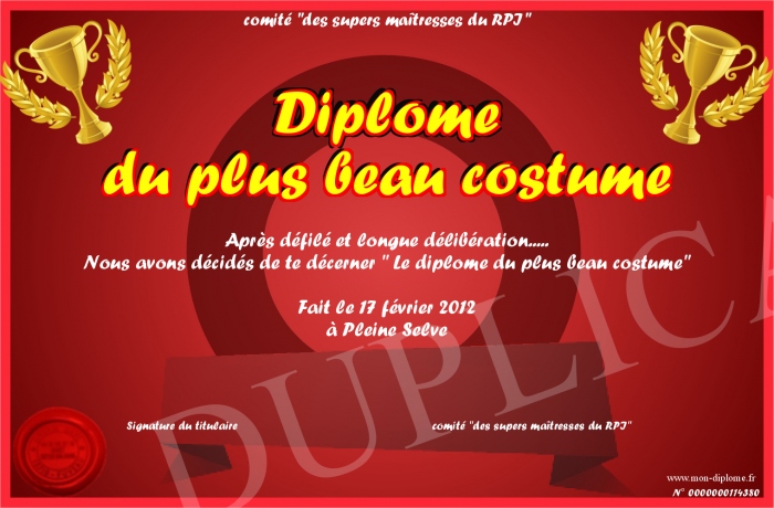 Envoyez par email votre Diplôme du plus beau costume personalisé