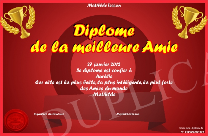 Envoyez par email votre Diplome de la meilleure Amie personalisé