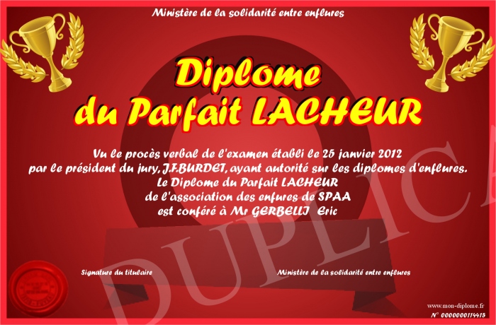 Envoyez par email votre Diplôme du Parfait LACHEUR personalisé