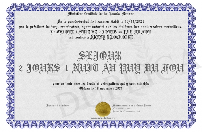Envoyez par email votre SEJOUR 2 JOURS 1 NUIT AU PUY DU FOU personalisé