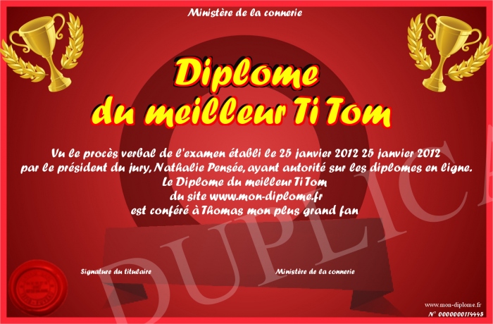 Envoyez par email votre Diplôme du meilleur Ti Tom personalisé