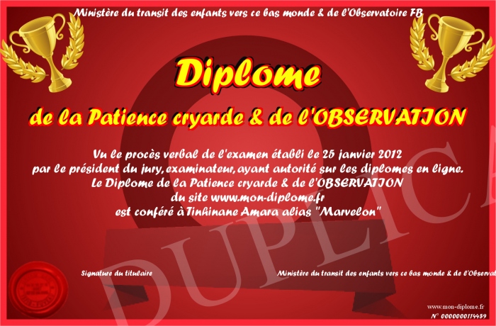 Envoyez par email votre Diplôme de la Patience cryarde & de l'OBSERVATION personalisé
