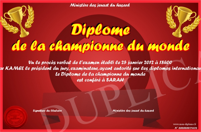 Envoyez par email votre Diplôme de la championne du monde personalisé