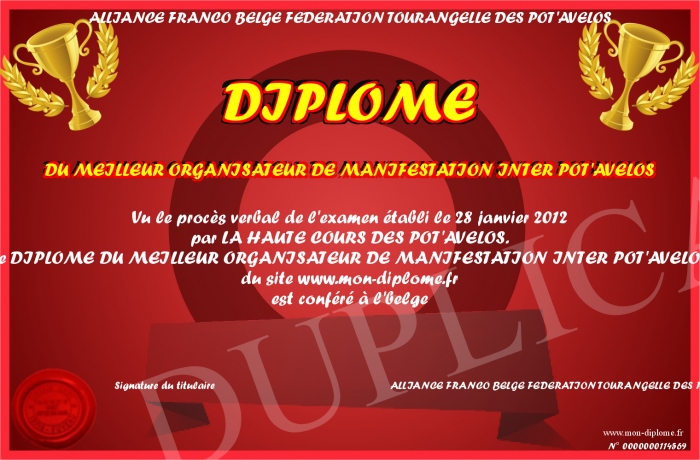Envoyez par email votre DIPLOME DU MEILLEUR ORGANISATEUR DE MANIFESTATION INTER POT'AVELOS personalisé