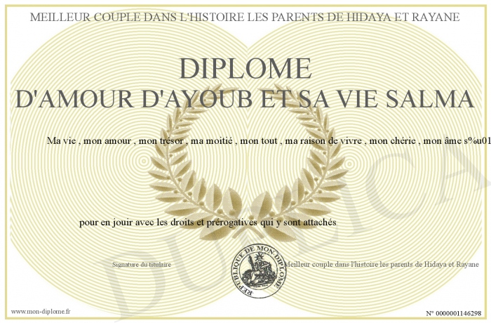 Envoyez par email votre Diplôme d'amour d'Ayoub et Sa vie Salma personalisé