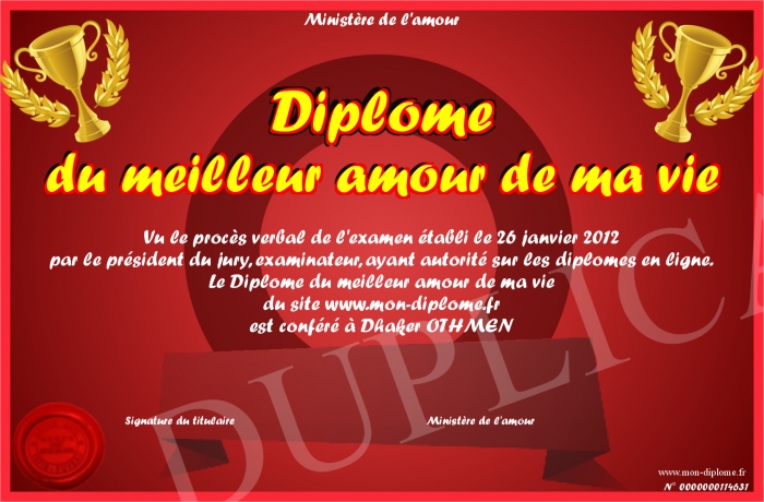 Envoyez par email votre Diplome du meilleur amour de ma vie personalisé