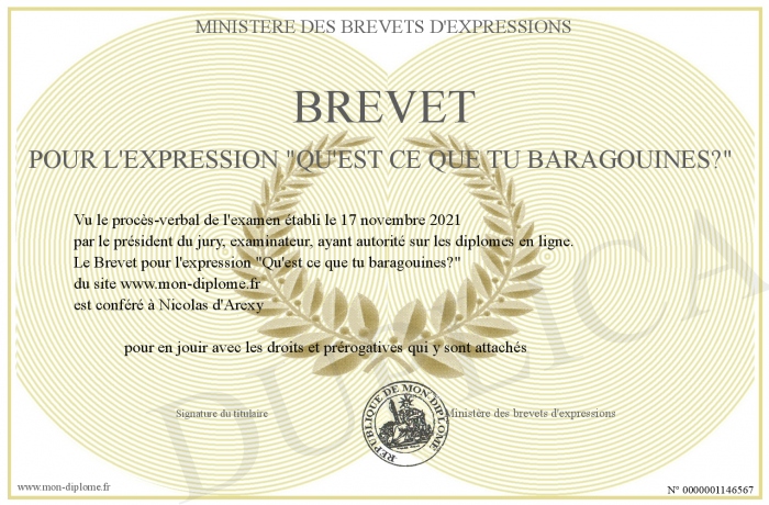 Envoyez par email votre Brevet pour l'expression -Qu'est ce que tu baragouines?- personalisé