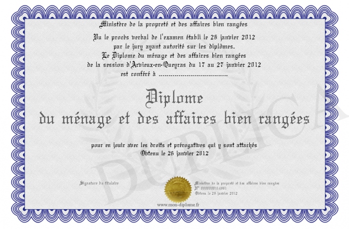 Envoyez par email votre Diplôme du ménage et des affaires bien rangées personalisé