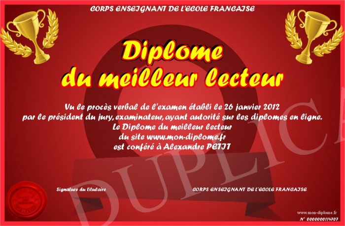 Envoyez par email votre Diplôme du meilleur lecteur personalisé