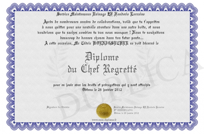 Envoyez par email votre Diplome du Chef Regretté personalisé