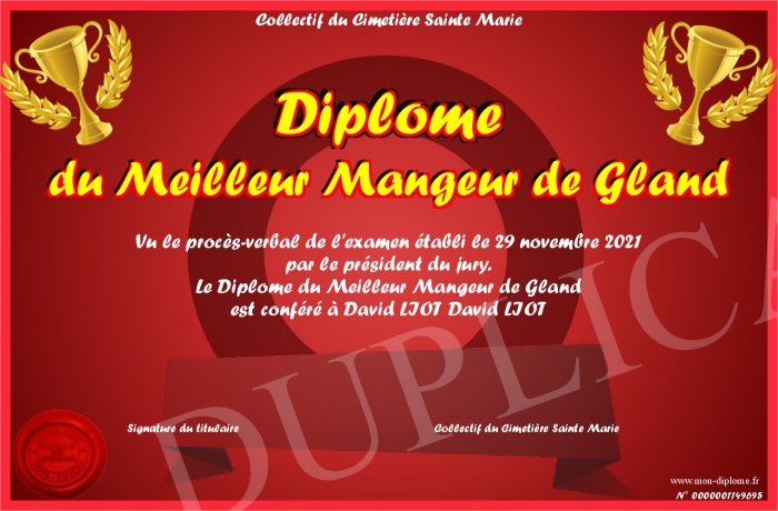 Envoyez par email votre Diplôme du Meilleur Mangeur de Gland personalisé