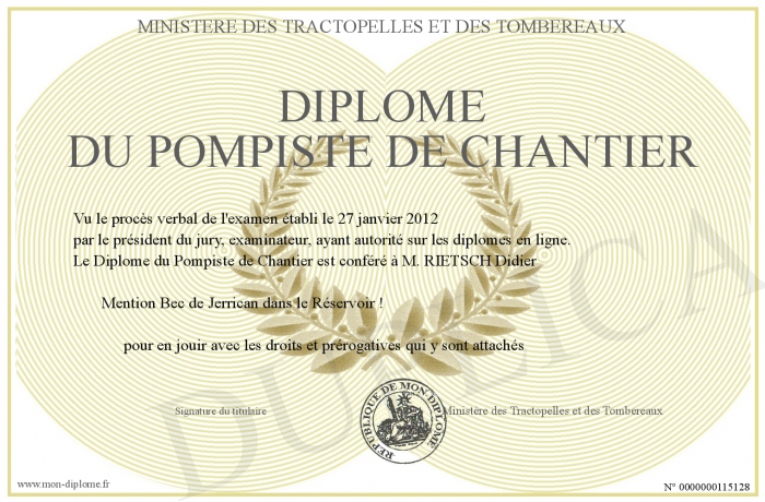 Envoyez par email votre Diplome du Pompiste de Chantier personalisé