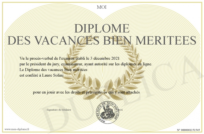 Envoyez par email votre Diplôme des vacances bien méritées personalisé