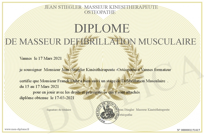 Envoyez par email votre Diplôme de masseur défibrillation musculaire personalisé
