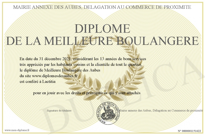 Envoyez par email votre Diplôme de la Meilleure Boulangère personalisé