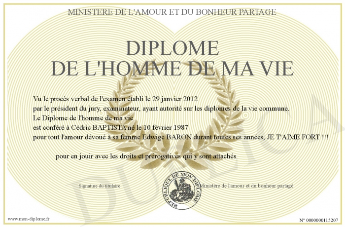 Envoyez par email votre Diplôme de l'homme de ma vie personalisé