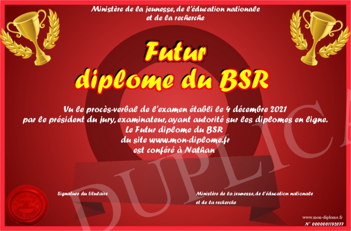 Envoyez par email votre Futur diplôme du BSR personalisé