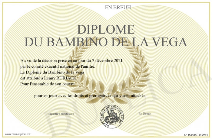 Envoyez par email votre Diplôme du Bambino de la Vega personalisé