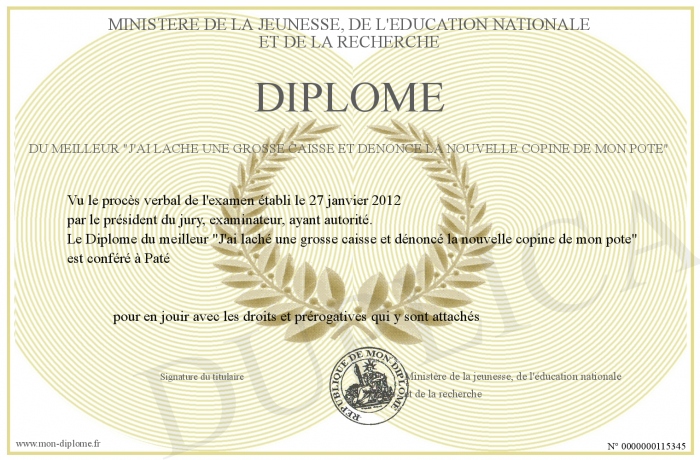 Envoyez par email votre Diplome du meilleur -J'ai laché une grosse caisse et dénoncé la nouvelle copine de mon pote- personalisé