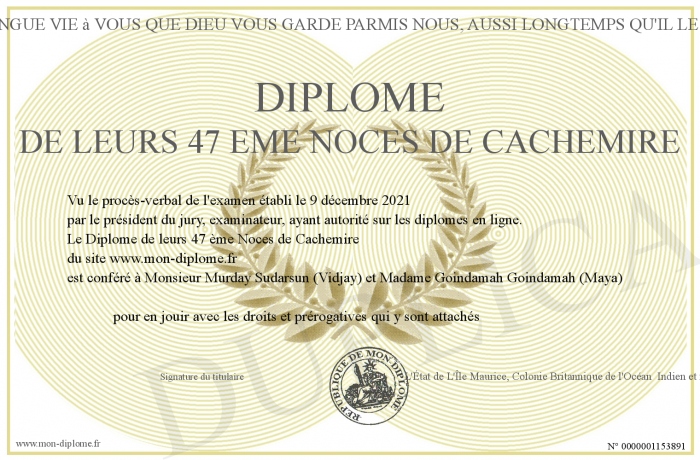 Envoyez par email votre Diplôme de leurs 47 ème Noces de Cachemire personalisé