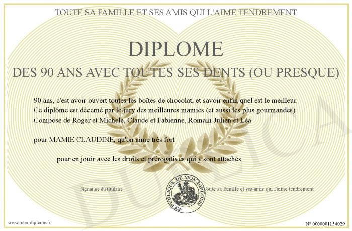 Envoyez par email votre Diplôme des 90 ans avec toutes ses dents (ou presque) personalisé