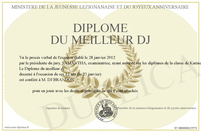 Envoyez par email votre Diplôme du meilleur dj personalisé