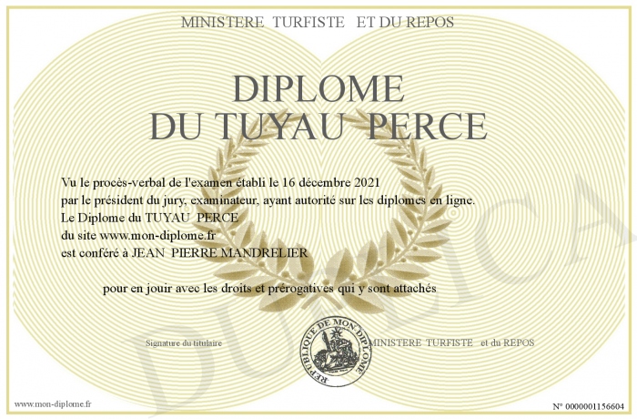 Envoyez par email votre Diplome du TUYAU PERCE personalisé